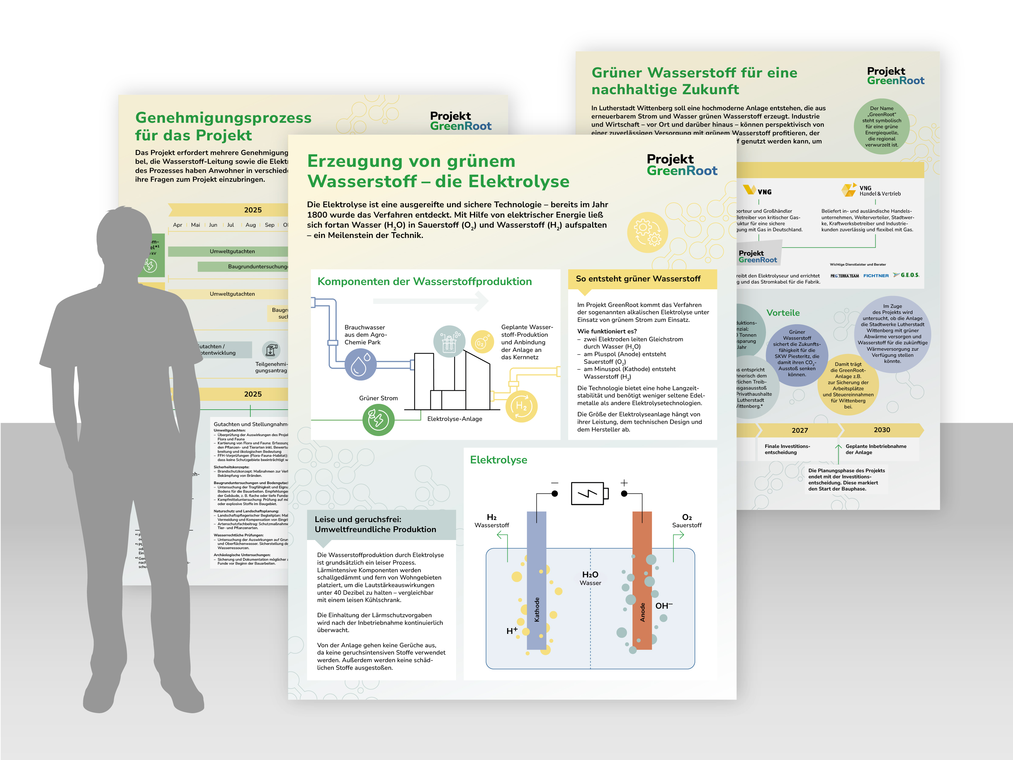 Das Projekt GreenRoot steht für eine nachhaltige Energieversorgung der Zukunft: In Lutherstadt Wittenberg soll eine hochmoderne Elektrolyseanlage zur Produktion von grünem Wasserstoff entstehen. Lots* begleitet die VNG AG und ihre Partner HyCC und VNG Handel strategisch in der Akzeptanzkommunikation und beim Dialog mit den Anwohnenden und Stakeholder*innen vor Ort.